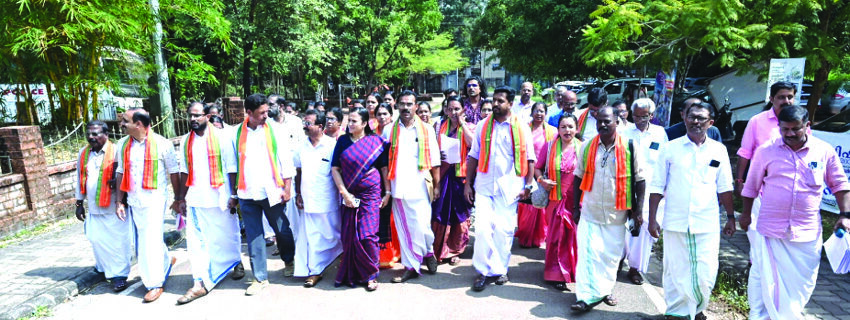 ಕಾಸರಗೋಡು: ಸ್ಥಳೀಯಾಡಳಿತ ಚುನಾವಣೆಯಲ್ಲಿ ಕಾಸರಗೋಡು ಜಿಲ್ಲಾ ಪಂಚಾಯತ್‌ಗೆ ಸ್ಪರ್ಧಿಸುವ ಎನ್‌ಡಿಎ ಅಭ್ಯರ್ಥಿಗಳು ನಾಮಪತ್ರಿಕೆ ಸಲ್ಲಿಸಿದರು. ಕಲೆಕ್ಟರೇಟ್‌ಗೆ ಮೆರವಣಿಗೆಯೊಂದಿಗೆ ತಲುಪಿ ಅಭ್ಯರ್ಥಿಗಳು ನಾಮಪತ್ರ ಸಲ್ಲಿಸಿದ್ದಾರೆ. ಎಂ. ವಿಜಯ ಕುಮಾರ್ ರೈ (ವರ್ಕಾಡಿ), ಮಣಿಕಂಠ ಪಟ್ಲ (ಪುತ್ತಿಗೆ), ರಾಮಪ್ಪ ಕೆ.ಪಿ (ಬದಿಯಡ್ಕ), ಬೇಬಿ ಜಿ. (ದೇಲಂಪಾಡಿ), ಮನುಲಾಲ್ ಎಂ. (ಕುತ್ತಿಕ್ಕೋಲ್), ಧನ್ಯಾ ಎಂ. (ಕಳ್ಳಾರ್), ಟಿ.ಡಿ. ಭರತನ್ (ಕಯ್ಯೂರು), ರಮಣಿ ಕೆ.ಎಸ್. (ಚಿಟ್ಟಾರಿಕಲ್), ಶೀಬಾ ಟಿ. (ಚೆರುವತ್ತೂರು), ಎ. ವೇಲಾಯುಧನ್ (ಮಡಿಕೈ), ಹೇಮಲತ (ಪೆರಿಯ), ಮಾಲತಿ (ಬೇಕಲ), ಸೌಮ್ಯಾ ಎಸ್. …