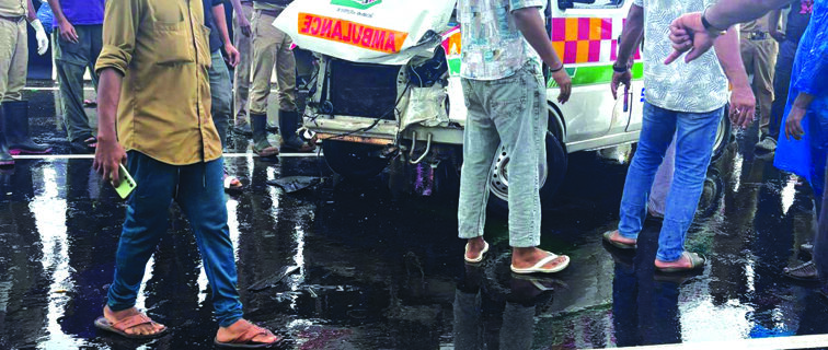 ಢಿಕ್ಕಿ ಹೊಡೆದ ಕಾರುಗಳಿಗೆ ಬಡಿದು ಮಗುಚಿದ ಆಂಬುಲೆನ್ಸ್: ಗೃಹಿಣಿ ಮೃತ್ಯು