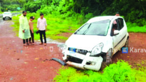 ಸಂಚರಿಸುತ್ತಿದ್ದ ವೇಳೆ ಟಯರ್ ಪಂಕ್ಚರ್: ನಿಯಂತ್ರಣ ತಪ್ಪಿದ ಕಾರು ಹೊಂಡಕ್ಕೆ ಪಲ್ಟಿ
