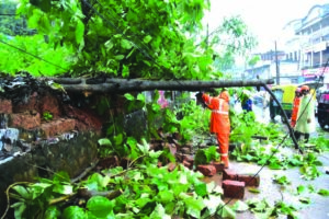 ಪೊಲೀಸ್ ಠಾಣೆ ಬಳಿ ರಸ್ತೆಗೆ ಬಿದ್ದ ಮರ: ಆವರಣಗೋಡೆ ಕುಸಿತ